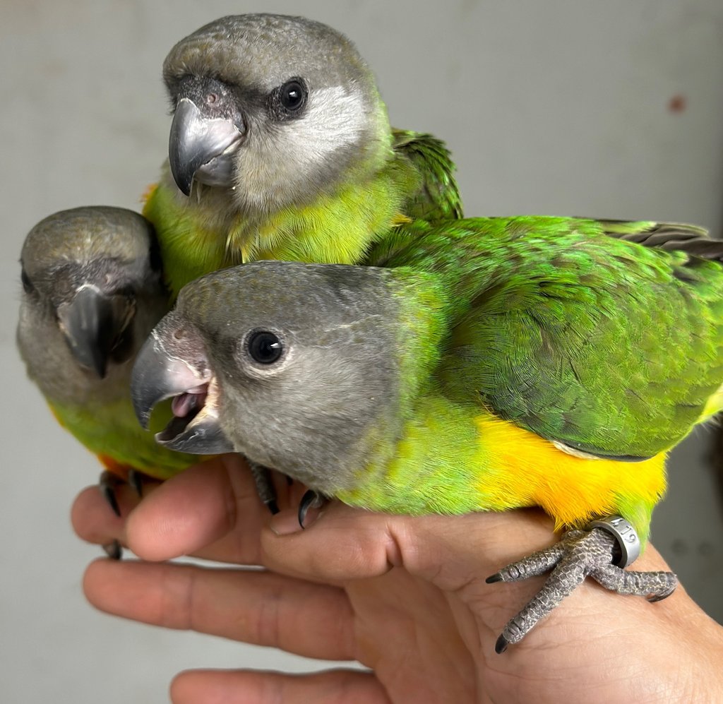 Le Youyou du Sénégal est un petit perroquet trapu, très coloré et attachant. Son plumage est majoritairement vert, avec une tête gris foncé et un ventre jaune ou orange vif (la couleur ventrale varie selon la sous-espèce). Il possède un bec noir puissant et un regard expressif. Sa taille compacte et son tempérament en font un compagnon très apprécié.