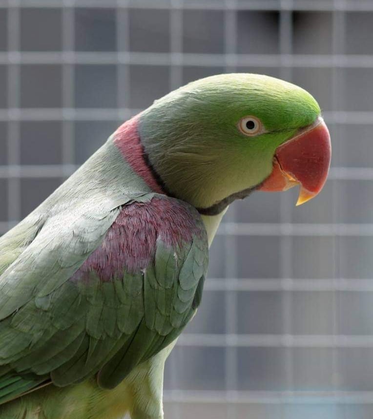 Le Grand Alexandre est un grand perroquet à longue queue, au plumage majoritairement vert. Il se distingue par ses marques caractéristiques : épaules rouges, bec rouge orangé puissant, et collier noir et rose chez le mâle adulte (dès l’âge de 2 à 3 ans). Son corps est allongé, sa queue très longue et pointue, avec des teintes bleu-vert. C’est un oiseau élégant et impressionnant.